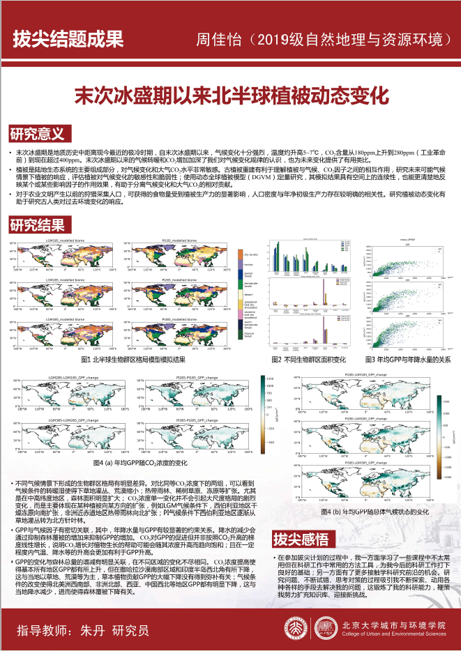 自然地理与资源环境专业的周佳怡同学分享了自己参加拔尖的感悟。她表示参加拔尖计划的过程是一个不断学习的过程,在学习专业课程之外,针对某一个领域去做更加深入的研究,从而找到自己感兴趣的方向,并将兴趣转化为学习的动力。同时,参与拔尖计划项目也督促自己展开了更广泛地学习,例如对数据分析、处理和编程相关课程的学习等。