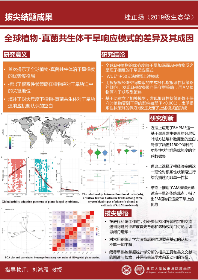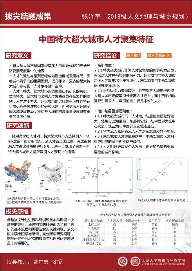 打造学院拔尖文化是地理科学与生态学拔尖基地培养模式创新的重要内容。经过长期的探索,学院通过规范拔尖同学日常管理、阶段考核(年度考核、中期考核和结题考核)、拔尖师生午餐交流、拔尖成果推送、拔尖网站建设、未名地理学士和生态学士评选、选派学生国际交流等,初步形成了学院的拔尖文化特色。拔尖文化周是学院拔尖文化的重要载体,为期一周的活动,展示了拔尖同学的研究成果,增进了师生交流,吸引了低年级同学树立参与拔尖科研实践的兴趣和信念,活跃了本科生拔尖文化氛围。