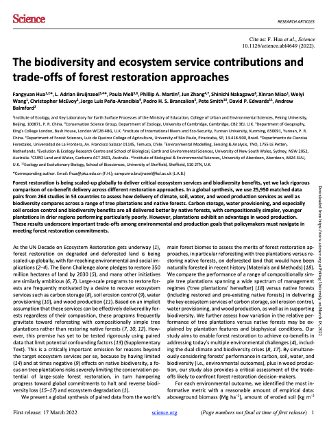 2022年3月18日,北京大学生态研究中心华方圆研究员带领的保护生态学课题组牵头7个国家研究人员组成的跨学科团队,在Science以长文形式在线发表题为“The biodiversity and ecosystem service contributions and trade-offs of forest restoration approaches”的研究论文。研究汇总分析了来自全球53个国家地区、264个野外研究的近2.6万条数据,发现与结构简单的人工林相比,天然林可以更好地支持生物多样性保护和实现地表碳存储、土壤保持、水源涵养的生态系统服务,但是人工林在木材生产方面具有优势。正规赌博平台-推荐可靠的网络赌博平台 生态研究中心研究员华方圆博士为论文的第一作者和共同通讯作者,保护生态学课题组成员王玮亦和苗新然为论文的共同作者。研究得到北京大学生态研究中心学科建设人才启动经费、中科院战略性先导科技项目、英国皇家学会牛顿基金、巴西圣保罗基金的资助。