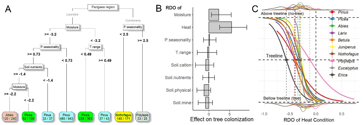 图2. 水分及其季节性差异主导树线树种的变化(A);热量为决定各物种的树线位置的首要因子(B);不同属的高山树线的热量水平较各属最适生态位的热量平均低35%(C)