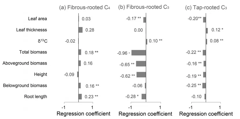 随干旱指数的增加,须根系C4植物与直根系C3植物/须根系C3植物的功能属性响应相反。研究发现,干旱对须根系C3植物的总生物量、地上生物量和株高的影响都强于对直根系C3植物和须根系C4植物(图3),而对主要由须根系C3植物组成的科(禾本科)的影响也强于对主要由直根系C3植物组成的科(菊科、豆科和蔷薇科)(图4)。