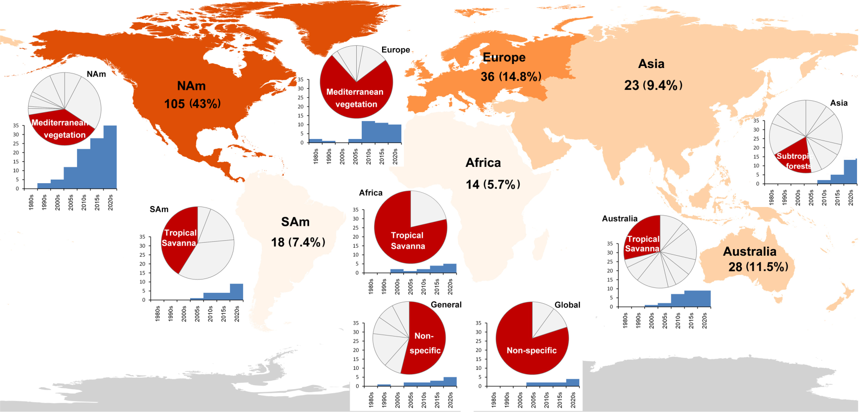专辑评论归纳了近30年以来全球火情模式变化研究的进展(Shen et al. 2025),发现已有研究主要集中于北美(43%)、欧洲(14.8%)和澳大利亚(11.5%),主要由中国作者贡献的亚洲研究近5年激增;而多火的非洲和南美洲相关研究相对不足。北半球火生态研究最多的生态系统是地中海气候区的灌丛植被,而南半球研究最多的是半湿润稀树草原植被(图1)。