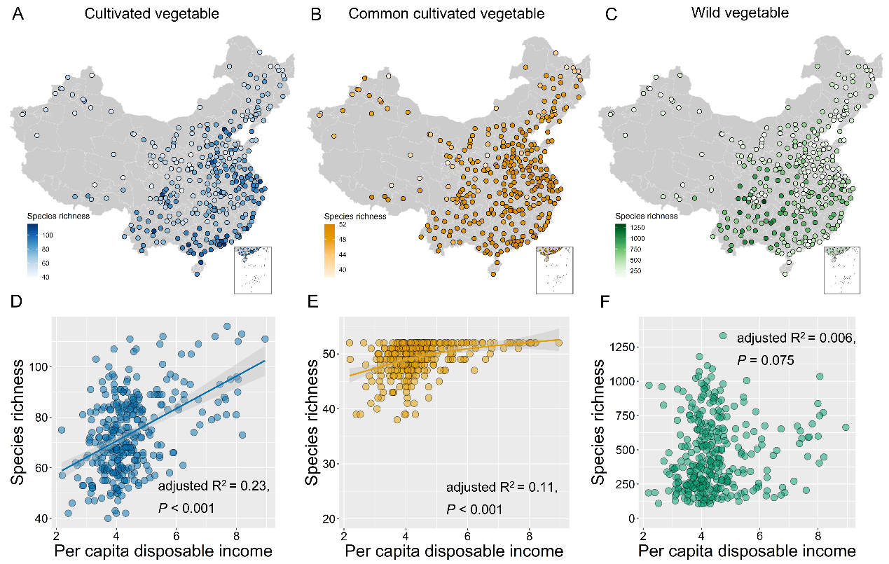 图 2 三类蔬菜物种丰富度的分布格局及其与人均可支配收入的关系。
