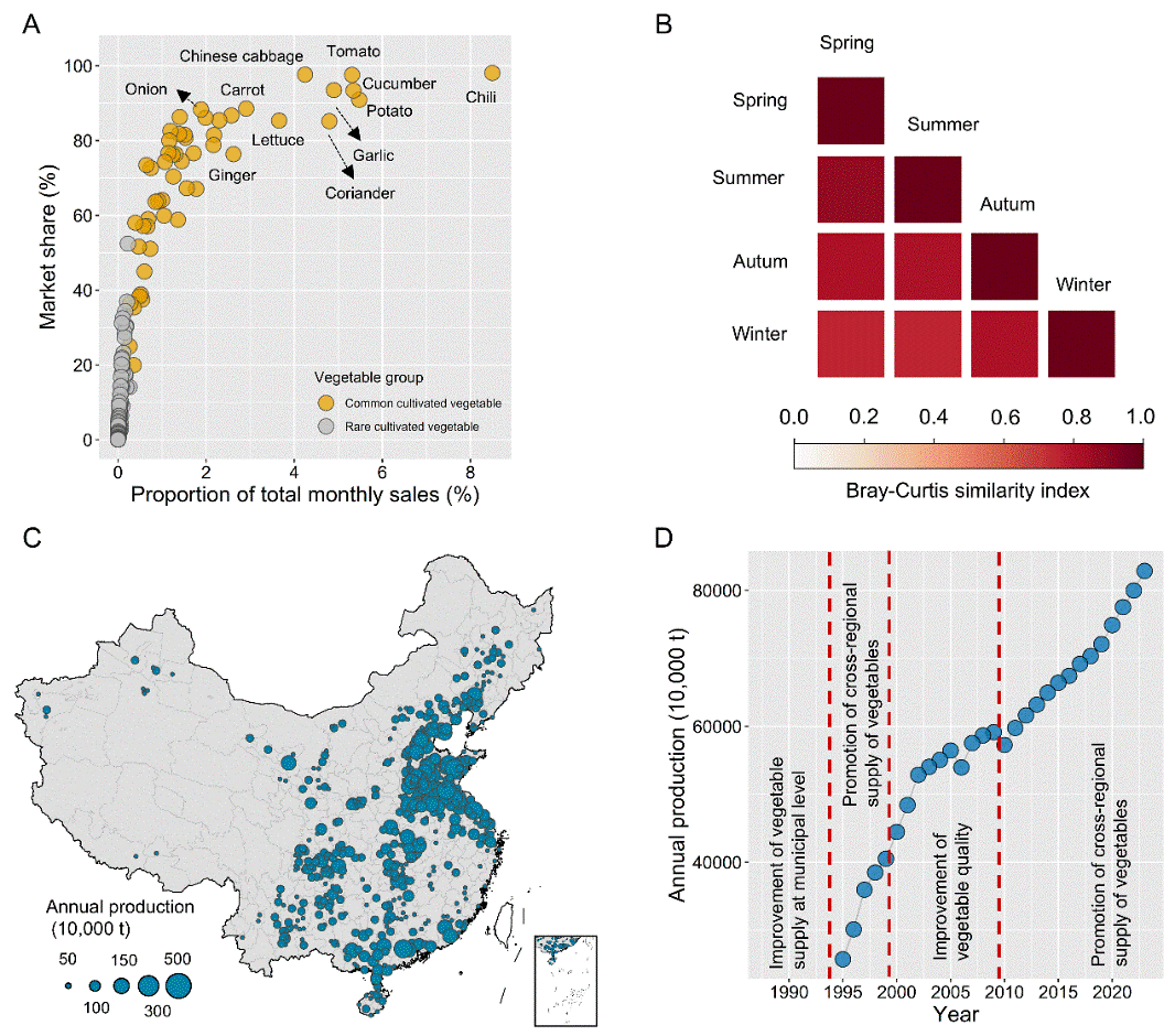 团队调查记录了我国330个城市中近3000家超市售卖的蔬菜物种和销量数据,同时构建了一个包含2461种野生蔬菜的综合数据库。结果发现,市场上售卖的栽培蔬菜有164种,物种多样性低于预期。市场中52种常见栽培蔬菜贡献了超过95%的销量(图1A)。总体上,较富裕的地区栽培蔬菜多样性更高,主要由于供应了更多价格较高的稀有栽培蔬菜所致。尽管如此,常见栽培蔬菜在全国范围供应十分均衡,过去几十年实施的菜篮子工程在很大程度上确保了不同地区的居民都能够公平的获取这些蔬菜资源(图2A)。然而,过度依赖少数常见栽培蔬菜可能增加蔬菜饮食趋于同质化的风险。