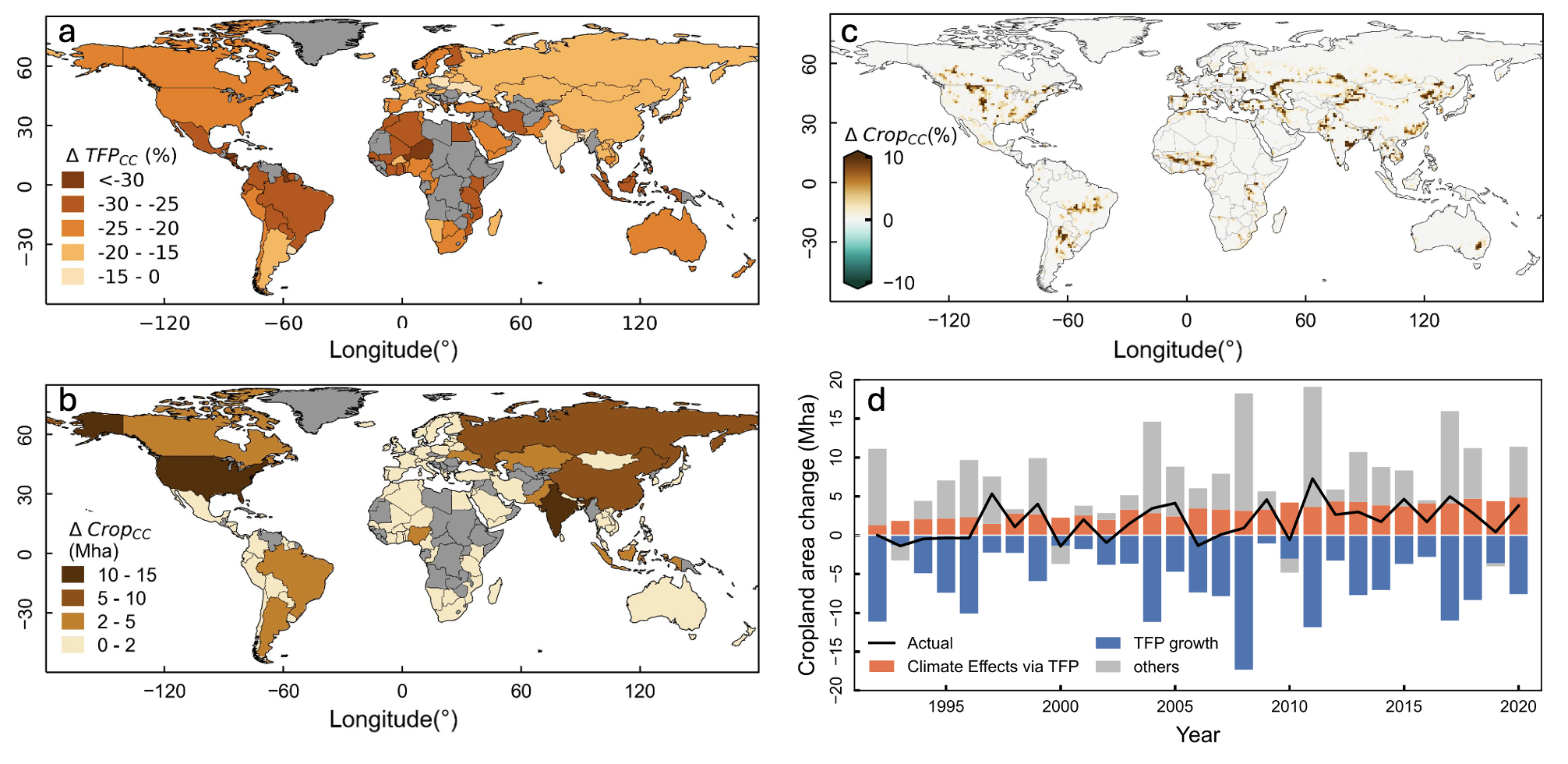 图 2. 1992-2020年农业全要素生产率(TFP)和耕地面积的变化。a, 气候变化对TFP的抑制作用;b, 国家尺度由气候变化驱动的耕地扩张面积; c, 格点尺度由气候变化驱动的耕地扩张面积;d, FAO统计的逐年耕地面积变动及其驱动因子分解