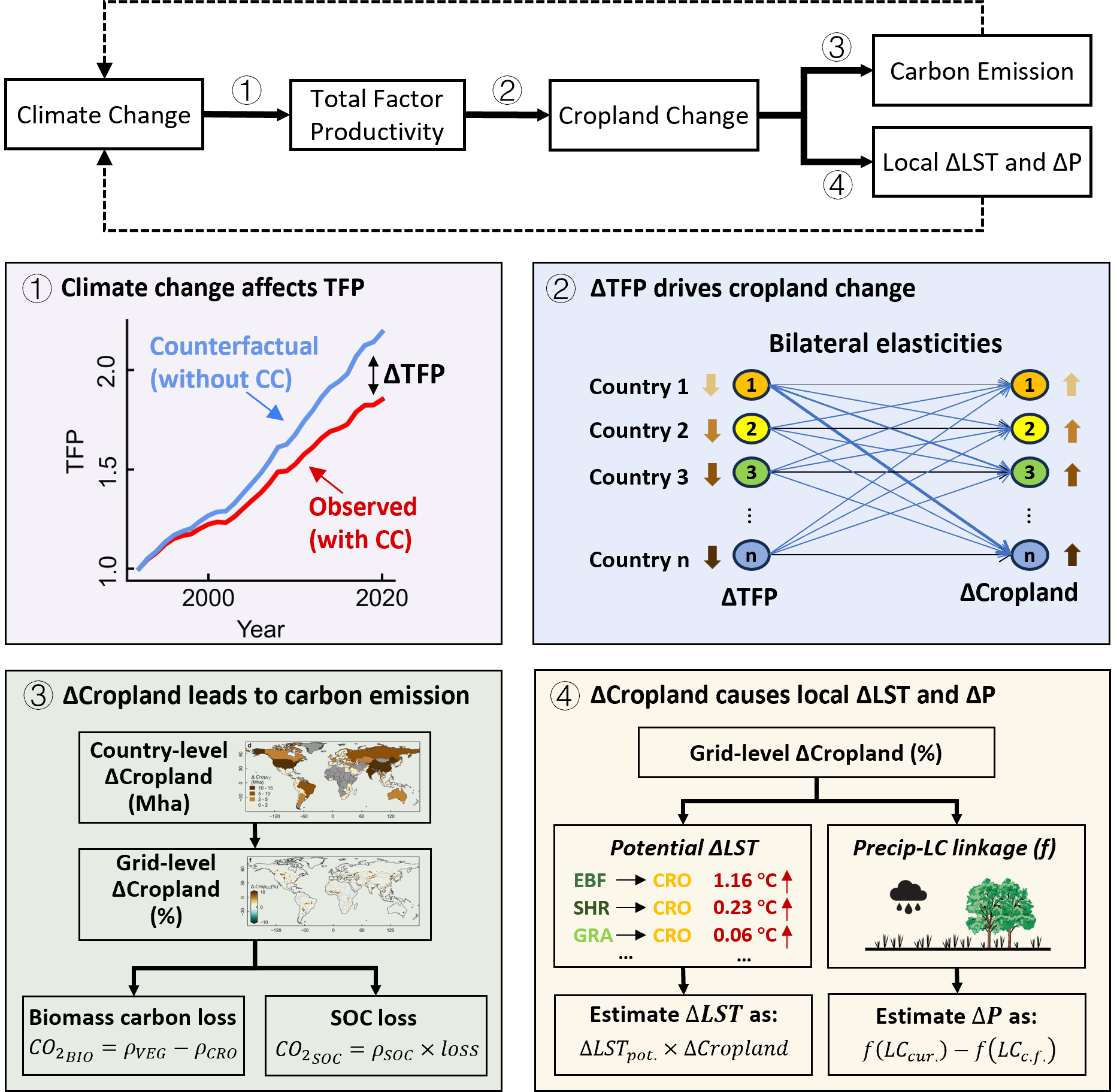 图 1. 气候变化和耕地扩张的正向反馈过程和量化框架。