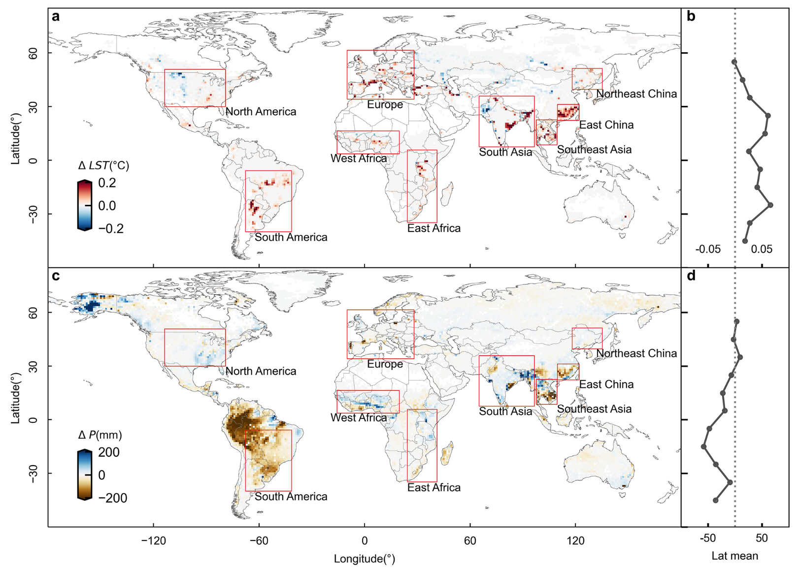 图 3. 耕地扩张在过去30年间引起的地表温度和降水反馈。
