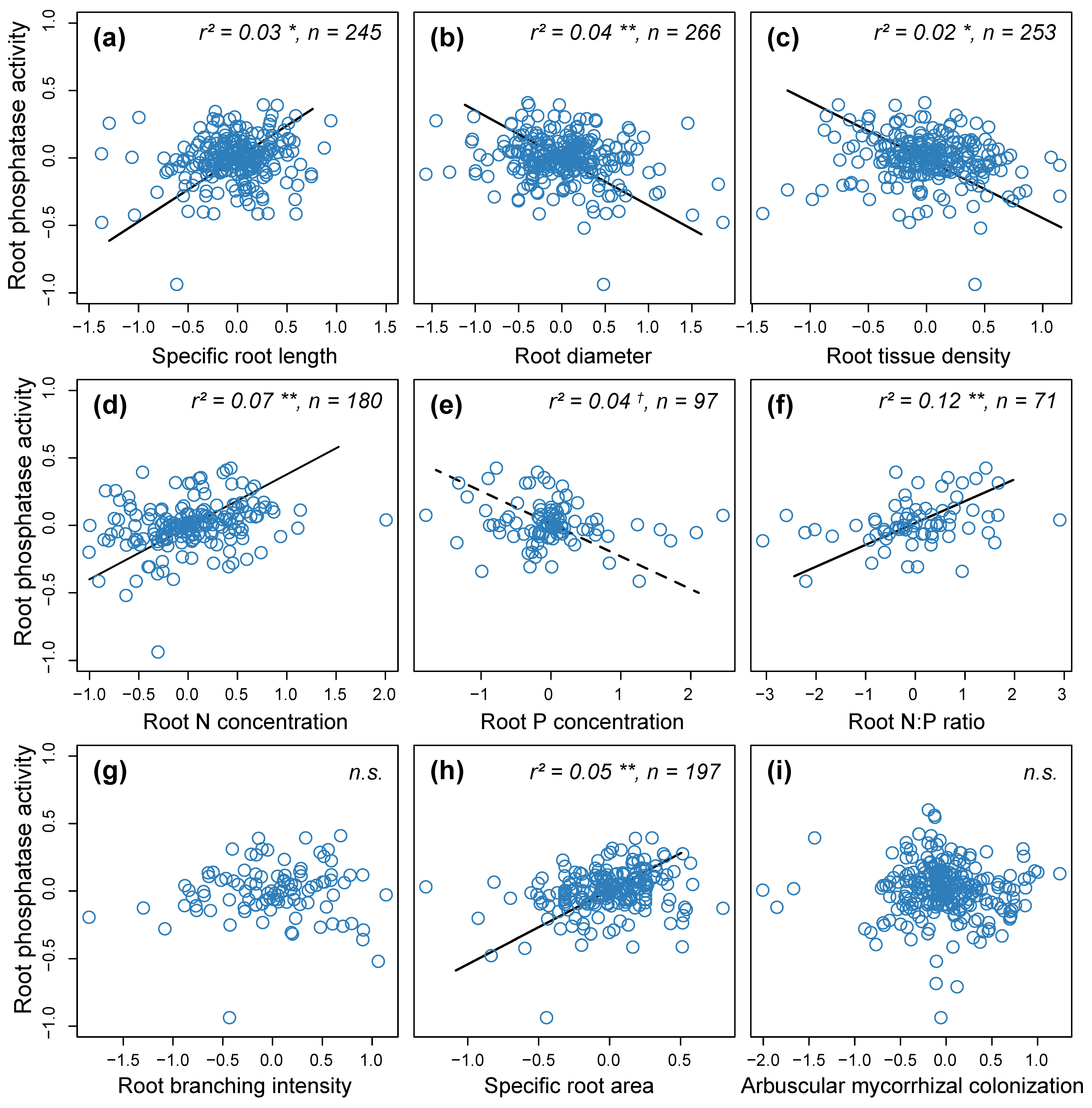 正规赌博平台-推荐可靠的网络赌博平台 朱彪教授课题组系统构建了一个包含全球83项研究、涵盖514个物种的细根磷酸酶活性数据集以回答上述科学问题(图1)。首先,研究发现细根磷酸酶活性在生活型间(草本、木本)和菌根类型间(丛枝菌根、外生菌根)均没有显著差异。然而,固氮植物细根磷酸酶活性显著高于非固氮植物(图2)。其次,本研究结果验证了细根性状主要沿两个独立维度变化,即二维“细根经济空间(Root Economics Space, RES)”。一个是以组织密度和细根氮含量为代表的“保守”维度(Conservation gradient),主要刻画细根资源获取能力;另一个是以细根直径和比根长为代表的“合作”维度(Collaboration gradient),主要刻画资源获取方式。本研究表明,细根磷酸酶活性主要位于“保守”维度的“获取”端,这种模式在不同植物功能群之间普遍存在(图3)。进一步发现,细根磷酸酶活性与比根长、比根面积、细根氮含量和氮磷比正相关,与细根直径、组织密度和细根磷含量负相关,而与细根分支强度、菌根侵染率没有显著关系(图4)。